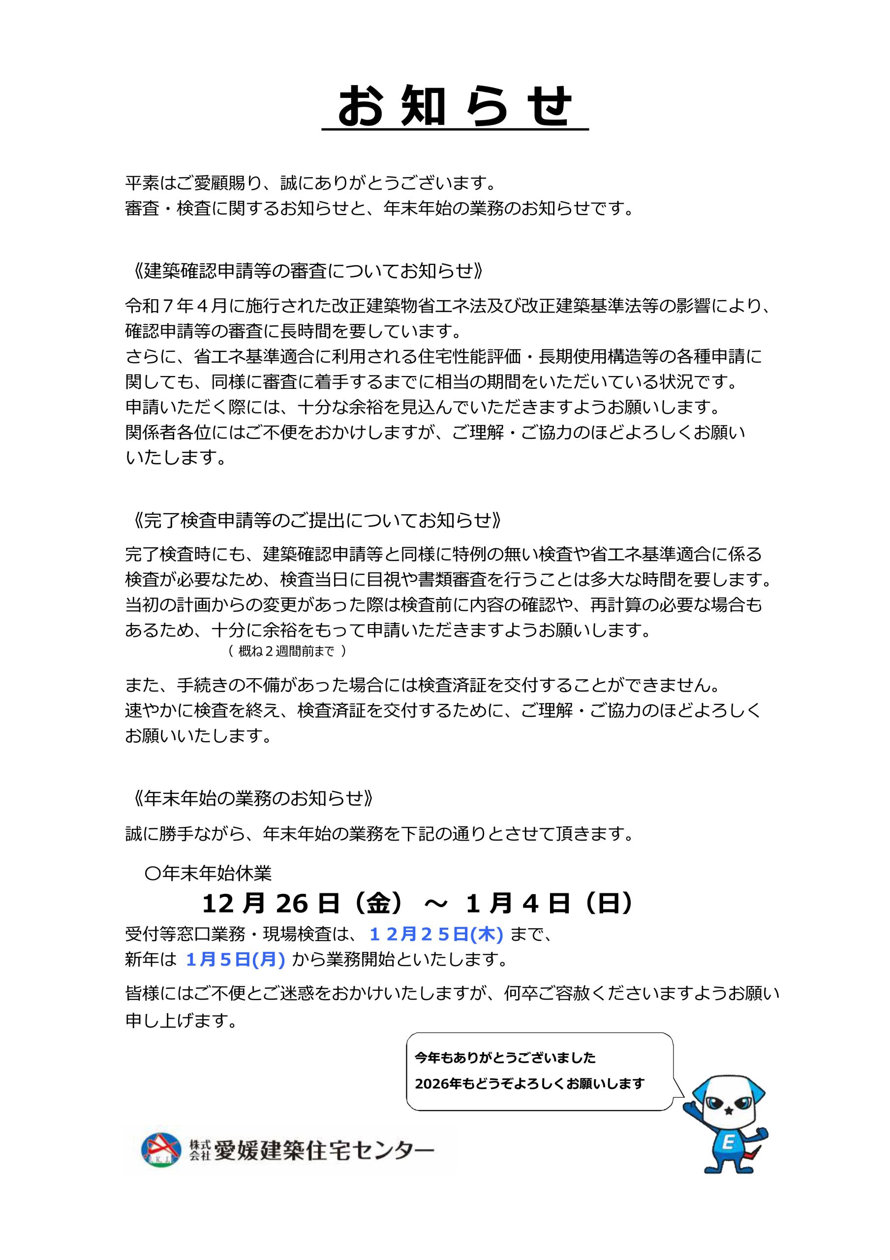 【審査・検査について】 【年末年始の業務について】のお知らせ