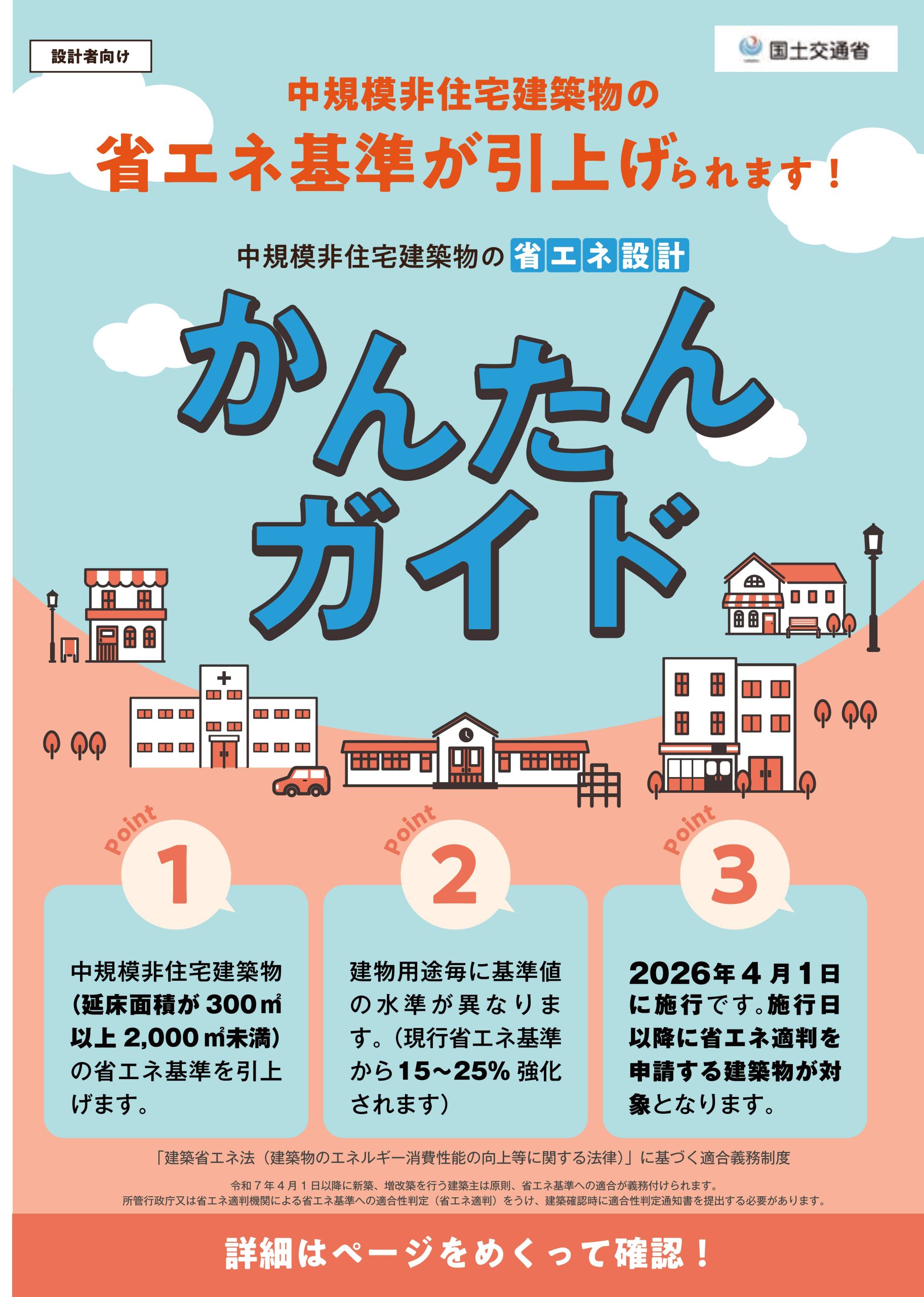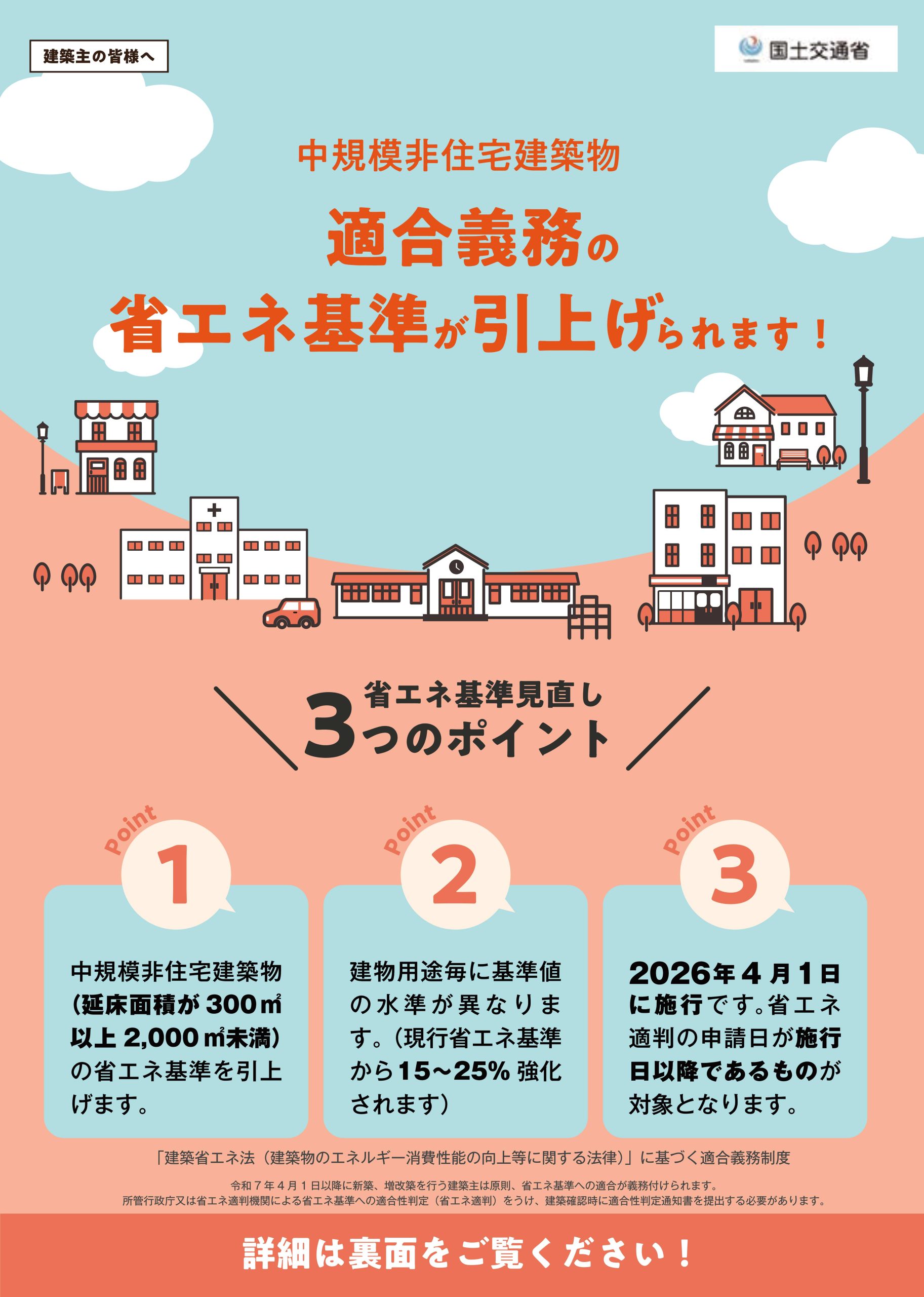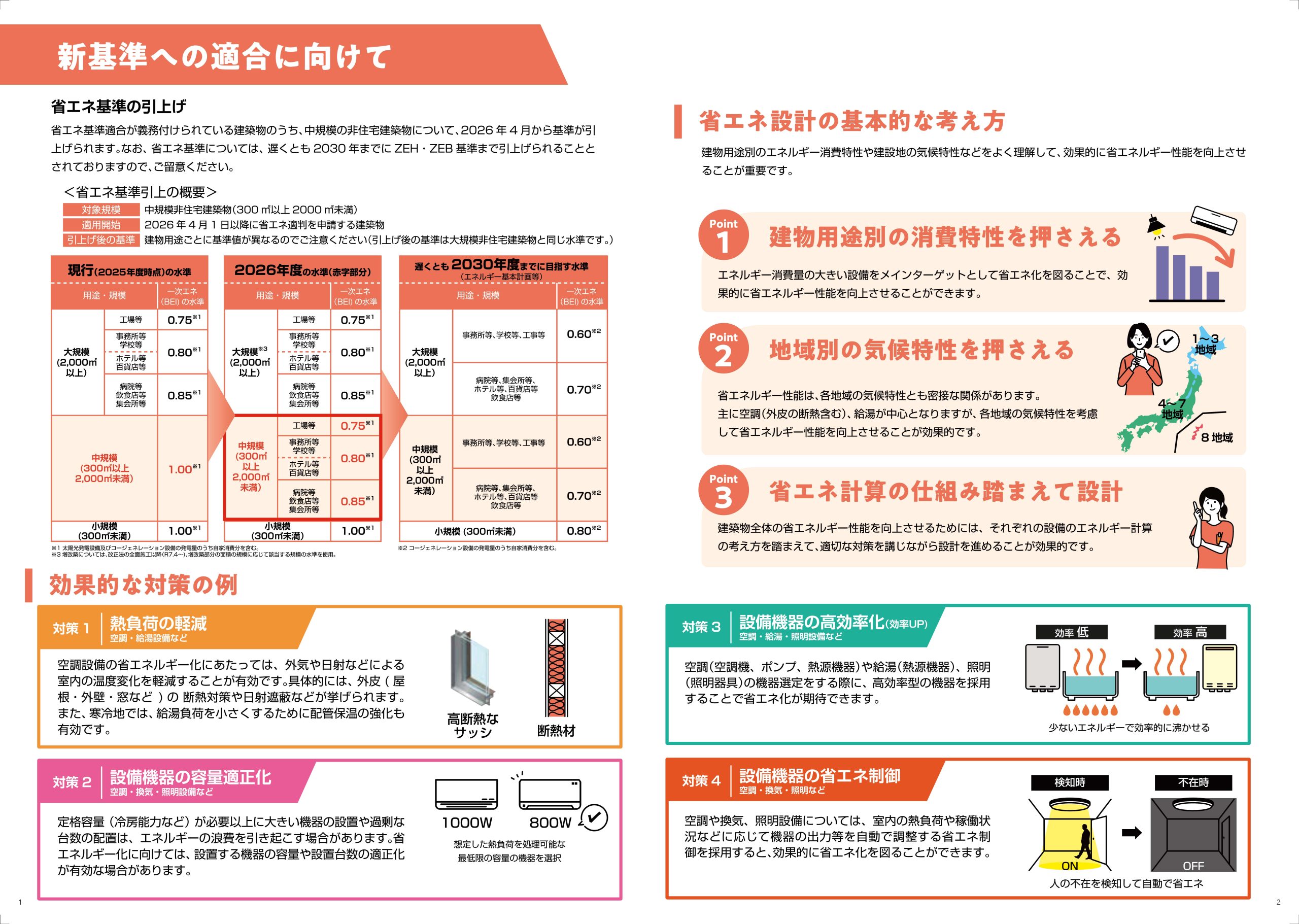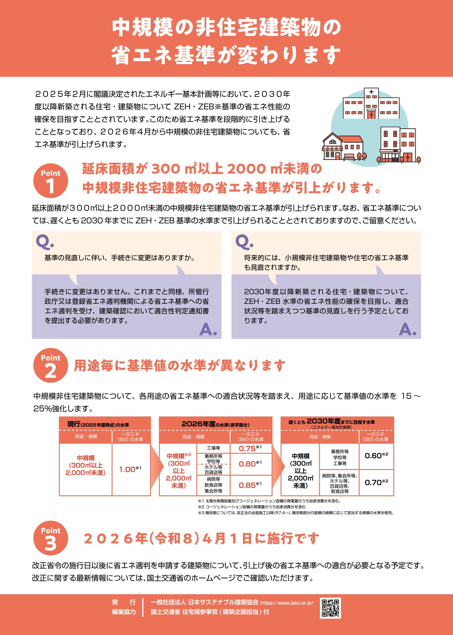 省エネ基準適合が義務付けられている建築物のうち、中規模の非住宅建築物について、2026 年4 月から基準が引上げられます。